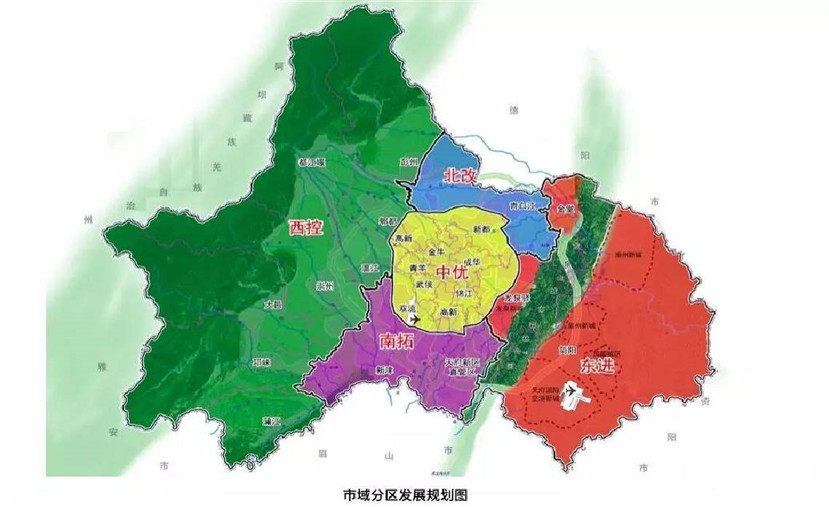 2017年4月,在中國(guó)共產(chǎn)黨成都市第十三次黨代會(huì)上,成都市委書(shū)記范銳平正式提出“東進(jìn)、南拓、西控、北改、中優(yōu)”發(fā)展戰(zhàn)略,成都的城市布局由原來(lái)的“兩山夾一城”轉(zhuǎn)變?yōu)椤耙簧竭B兩翼”,以龍泉山為界,西邊為中心城區(qū),東邊則將塑造全新的東部產(chǎn)業(yè)新城——東部城市新區(qū)。