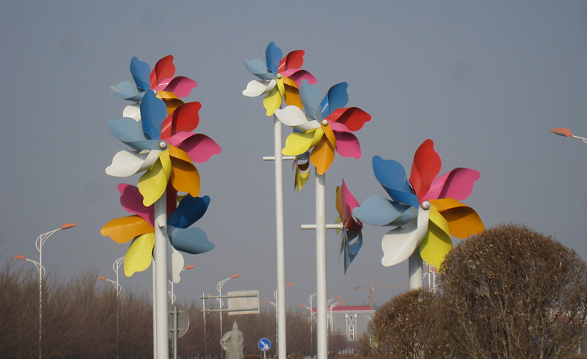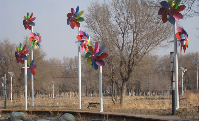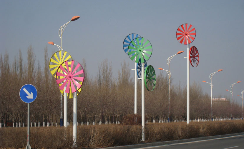 設計理念以風車造型為創作元素,經過設計者的提煉,設計為圓形風車和四葉風車兩種。葉片根據風力學進行設計,可隨風轉動,具有生命力。本項目中共運用了五柱景觀風車,安裝在達坂城洛賓路。